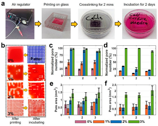 Representative images and quantitative results of pore area measurement analysis are depicted in Figure 5. Figure 5a depicts the sequential steps of the experiment. Figure 5b illustrates images of the six-layer printed pattern with four different bioink mixtures. The first column shows the images that were taken after printing, and the images in the second column are those taken after two days of incubation. The remainder of the experimental images for all concentrations and layers are available in Figure S2. According to Figure 5b, the 4% pure alginate could not keep its shape and spread around easily due to its low viscosity, filling in the pore area after deposition. The print quality was improved by adding gelatin (e.g., 1, 2, and 3% w/v), compared with pure 4% w/v alginate. For gelatin concentrations above 3% w/v, the high viscosity of the bioink precluded the bioprinting process. The quantification of experimental images is presented in Figure 5c–f. Figure 5c,d show normalized pore number—the percentage of successfully printed pores of two-layer print and six-layer print, respectively, after printing (1), after crosslinking (2), and after incubating for 48 h (3). In two-layer samples, 0% gelatin maintains approximately 25% normalized pore number after printing, after crosslinking, and after incubating. Increasing gelatin concentration to 1% w/v increased the normalized pore number to 50%, whereas 2% and 3% gelatin increased the normalized pore number to 98%. This increase is due to the increased viscosity that provides better printability. For the six-layer print (Figure 5d), 0% gelatin could not form a grid pattern, resulting in a normalized pore number of 0%. Comparing the six-layer with two-layer prints, the normalized pore number decreased by approximately 70% for 1% and 2% w/v gelatin due to filament collapse as a result of low bioink viscosity. However, no decrease was observed in the normalized pore number for 3% w/v gelatin after printing and after crosslinking, and only a 10 % decrease was recorded after incubation. Thus, 3% w/v gelatin in alginate yielded the best print quality for all three conditions.
