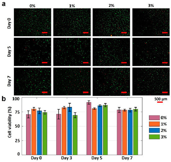 The gelatin concentration was varied to characterize the effects of gelatin concentration on the cell viability in 4% alginate. The fluorescence images of printed NIH 3T3 mouse embryonic fibroblast cells in four different bioinks over seven days are presented in Figure 6a. The cell viability results for varying gelation concentrations are depicted in Figure 6b. Pure alginate had the lowest cell viability of 70%. Adding gelatin increased the cell viability by approximately 15% on day 0. The cell viability of pure alginate was increased by 21% (to 91%) within five days of incubation, while the cell viabilities for other bioinks were increased by 1%, 11%, and 16% for the 1%, 2%, and 3% w/v gelatin concentrations, respectively (from day 0 and day 5). The lower increase in cell viability for bioinks with 1%, 2%, and 3% w/v gelatin (compared with pure alginate) can be attributed to their higher mechanical strength, which, in turn, can prohibit the nutrient and oxygen transfer to the cells. On day 7, the cell viability for all bioinks decreased, ranging from 4 to 14%, which can be attributed to the lack of nutrients and oxygen. In addition, it is observed that the highest cell viability belongs to the 3% gelatin on day 7. In conclusion, the proposed bioink, 3% w/v gelatin, is biocompatible and has the potential for 3D bioprinting of tissues and organs.