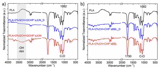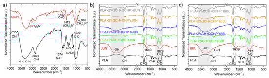 ATR-FTIR spectra of CH and QCH (a), and of pure PLA and the extracts (JUN, BBL), along with all functionalized foils (b,c).