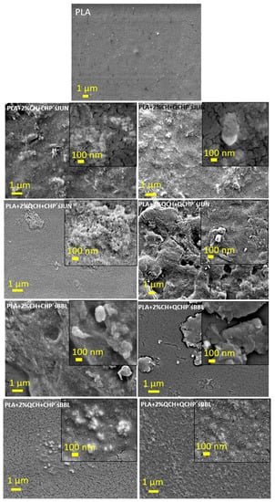 SEM images for PLA films coated with first 2% CH or QCH, followed by a second layer in the form of micro/nanoparticles of CH, or QCH with embedded extracts (namely JUN and BBL).