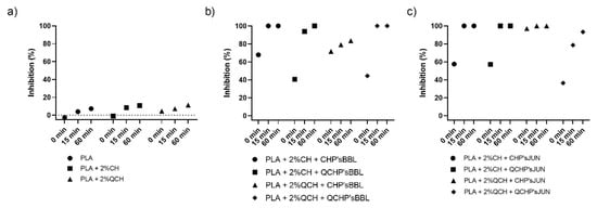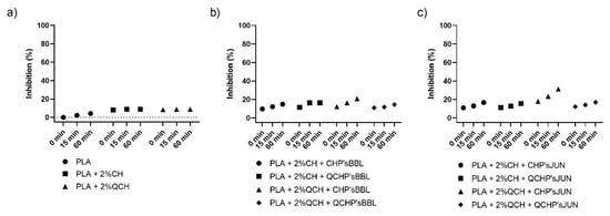 Percentage of inhibition of oxidation of the reference PLA films (a) and functionalized PLA films ((b), BBL extract; (c), JUN extract) determined with a DPPH assay.