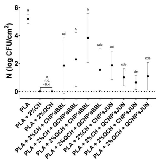 Number of Staphylococcus aureus determined on the reference PLA films and functionalized PLA films after 24 h. There was no statistically significant difference between the average values of the samples marked with the same letter.