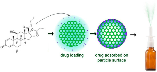 Weighted fluticasone propionate was dissolved in methanol at a concentration of 100 mg/100 mL. FP solution and 100 mg of MSN were combined while being stirred at 1500 rpm for three hours and then stored for three days. The loading and storing were done in closed containers outside in the open air. To fully remove the methanol, the mixture was then dried at 55 °C for more than a day. The dried composite samples, referred to as MSN-FP, were washed with water and again dried. Drug loading sketch was shown in Figure 1.