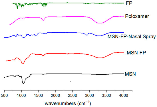 FTIR analysis of MSN, MSN-FP, MSN-FP-Nasal spray, poloxamer and FP.