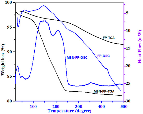 A differential Calorimeter modeled Q-2000 made by TA USA was used to evaluate FP and MSN-FP. The temperature range was 25 °C to 500 °C, adjusted at a rate of heating 20 °C/min. The response of FP and MSN-FP formulation against heat flow was shown in Figure 4. As shown in Figure 4, the DSC curve of FP exhibits an endothermic peak at 50 °C, which corresponds to its intrinsic melting points due to dehydration and elimination of other volatile components. An exothermic peak at about 150 °C is observed, which can be attributed to glass transition temperature Tg. At approximately 250 and 415 °C, two overlapping endothermic peaks have been found. This thermal process suggested that FP significantly degrades during the melting phase, and it was observed that 8% substantial weight loss was found over the same temperature range (TGA Figure 4). The complex thermal events around the melting point indicate that FP undergoes significant degradation during melting. It agrees with the observed significant weight loss of 8% detected over the same temperature range by TGA Figure 4 [43]. In MSN-FP, no sharp exothermic peak was found at 50 °C, but an exothermic peak was found at the same position and temperature that recognized that FP is poured into pores of MSN in amorphous form. However, a weak and broad exothermic peak appears at 150 °C and 200 °C in MSN-FP, which indicates a noncrystalline state of drug entrapment into MSN. The 16.2% weight loss observed over the temperature range of 25–250 °C by TGA Figure 4 agrees with the calculated water content of 3.3% for the monohydrate. The melting peak depression of the MSN-FP may be attributed to the partial interaction of the drug with the surface of mesoporous nanoparticles which are rich in silica groups, causing partial amorphization of the FP drug [47].