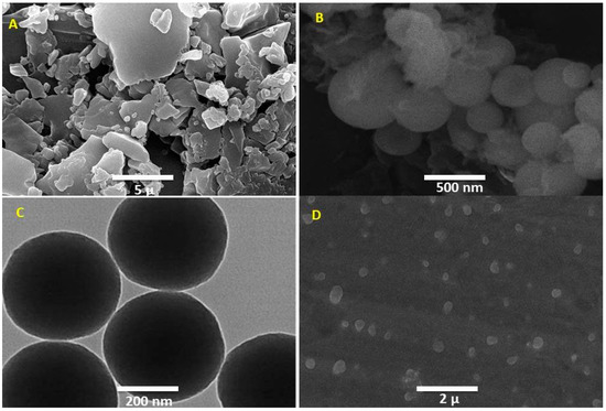 TEM and SEM images: (A) SEM image of API, (B) SEM Image of MSN-FP, (C) TEM images of MNS-FP and (D) SEM images of MSN-FP-Nasal spray.