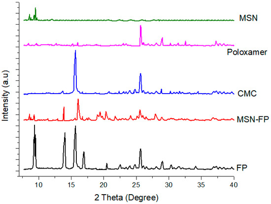 FP exits sharp peaks with crystalline forms [43]. XRD patterns were similar to that of polymorphs with major peaks observed at characteristic diffraction peaks at 2-theta values of 9.3, 13.3, 15.8, 16.3, 20.9, 12.5, and 26.4 at 2-theta values [43], corresponding to the crystalline trend of FP. However, no prominent sharp peaks were noted except 13.3 and 16.1 in MSN-FP that confirmed the shifting of FP into amorphous form because of enlarged pore confinement with polymer matrix.