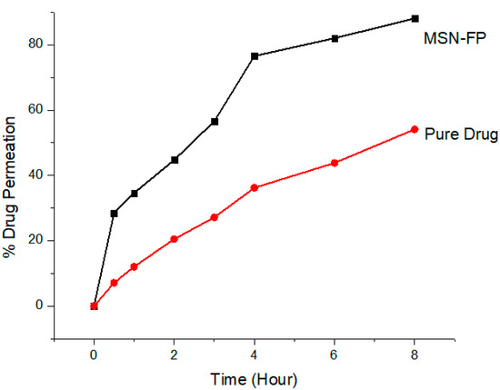 This experiment was performed by using Franz Diffusion Cell. Silicon membrane was used in this experiment. The permeation through the silicon membrane of the MSN-FP and the pure drug was evaluated in vitro, using a vertical Franz diffusion cell (SES Analytical Systems, GmbH, Germany), with a donor surface area of 1.2 cm2 and a receptor volume of 5.2 mL. The semisynthetic membrane (silicon SAMCO (Nuneaton, UK) was placed between the donor and receptor chambers of the Franz diffusion cell having the epidermal side up. The donor chamber of 1.0 mL volume covered with paraffin was filled with a sample. While the receptor chamber has phosphate buffer saline of pH 7.4 at 37 ± 0.5 °C temperature circulating water. The membrane was placed in contact with the receptor phase for the time of 0.5 h at a temperature of 37 ± 0.5 °C earlier to the experiment. Samples (0.5 mL) were withdrawn at pre-determined time intervals over 8 h (0.5, 1, 2, 4, 6, and 8 h) of receptor phase and analyzed through a UV spectrophotometer at 254 nm while the cell was re-filled with an equivalent concentration of newly prepared buffer solution [34,35].