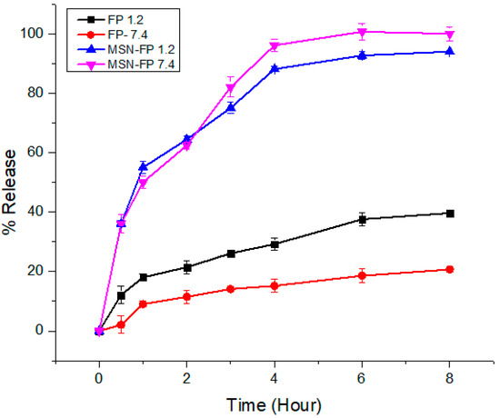FP pure drug and formulation MSN-FP was synthesized with the aim to maintain the drug release for up to 8 h in order to deliver over-period action. The in-vitro FP release profile from the MSN-FP showed a biphasic type sustained release pattern (Figure 9). Pure drug release pattern is very slow in both pH (1.2 and 7.4) which means that FP is an insoluble drug (0.00402 mg/mL water solubility). In both media, it has shown almost the same pattern of poor solubility (30% release). Formulations (MSN-FP) exhibited a burst release pattern of the drug (35–40%) within the first hour of dissolution followed by the continual drug release pattern. A possible explanation for the initial burst release of MSN-FP is that some of the drug molecules may have adhered to the surface of the silica nanoparticles, causing a rapid increase in drug dissolution during the first hour of the release study. The negatively charged carboxyl group of FP interacts weakly with the negatively charged silanol group of silica nanoparticles which is unable to stop the burst release [49]. The later sustained release trend was attributed to the slow diffusion of the drug from silica nanoparticles up to 84–90% within both media.