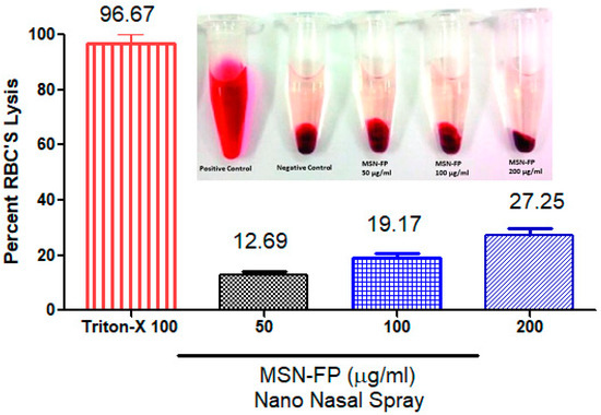 The compatibility of MSN-FP nano nasal spray with blood was investigated through hemolytic analyses. The results of hemolytic analyses (Figure 10) showed that MSN-FP nano nasal spray did not cause significant hemolysis after the administration at concentrations 100, 150, and 200 µg/mL, but the rate of hemolysis was noted towards high concentration i.e., 200 µg/mL. MSN-FP caused an immediate onset of hemolysis that soon reached a plateau of 27.25% hemolysis at 200 µg/mL probably due to its negative charge which might expel RBCs (−10 mV), which indicated that the extent of hemolysis was concentration-dependent (Figure 10). Results of the present study demonstrated that cell viability depended upon concentration and cells were alive after incubation with MSN-FP nano nasal spray which confirms blood compatibility.