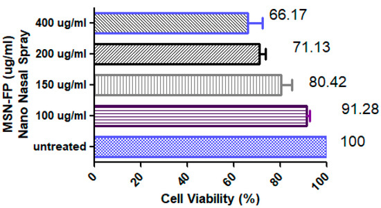 The University of Lahore got a human hepatocyte cell line (HepG2) from the American Type Culture Collection (ATCC). At room temperature, 95% (v/v) humidity, and 5% (v/v) CO2, cells were maintained in DMEM supplemented with 10% (v/v) FBS. One day before MSN incubation, cells were sown close to confluency. As a measure of cell viability and proliferation, the MTT assay (3-(4,5-dimethylthiazol-2-yl)-2,5-diphenyltetrazolium bromide) measures the activity of the mitochondrial succinate dehydrogenase enzyme [36]. For 24 h, different MSN-FP nano nasal spray doses (50–400 g/mL) were applied to the cell culture medium. Each well was then filled with 15 µL of MTT (5 mg/mL) in phosphate buffered saline (PBS), which was added, and incubated at 37 °C for an additional 4 h. A microplate reader was used to measure the formazan crystals’ absorbance at 570 nm after the medium had been gently aspirated with an MTT, solubilized in 100 µL of dimethylsulfoxide (DMSO), and formed in each well [37]. The percentage of cell viability was determined using the following formula.