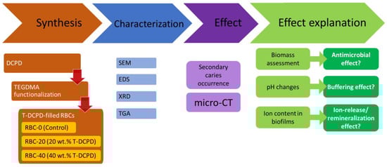 Flowchart illustrating the experimental setup. Triethyleneglycol-dimethacrylate (TEGDMA)-functionalized dicalcium phosphate dihydrate (DCPD)-filled resin-based composites (RBCs) were obtained. Then, materials were extensively characterized, and their activity was evaluated in terms of their ability to prevent/reduce secondary caries occurrence. Additional experiments were performed to explain such an activity, as shown. SEM, scanning electron microscopy, EDS, energy-dispersive x-ray spectroscopy, XRD, x-ray diffraction, TGA, thermogravimetry, micro-CT, micro-computed tomography.