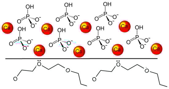 Diagram illustrating the DCPD-TEGDMA interaction. The DCPD structure is represented by the calcium ions and hydrogen phosphate tetrahedra. At the DCPD-TEGDMA interface, two triethylene glycol groups from TEGDMA are represented, with ion-dipole bonds established between one of their oxygen atoms and the calcium ion.