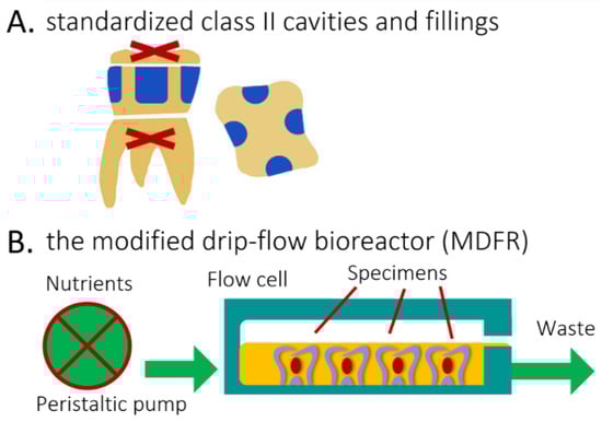 Explanation of the methods and procedures. (A), Lateral and top view of de-rooted human molars each harboring four standardized class II cavities (in blue, 4 mm width, 2 mm depth, and 6 mm height), with cervical margin in dentin. (B) Diagram of the open system bioreactor based on a drip-flow bioreactor. Specimens are depicted covered by the nutrient broth (orange).