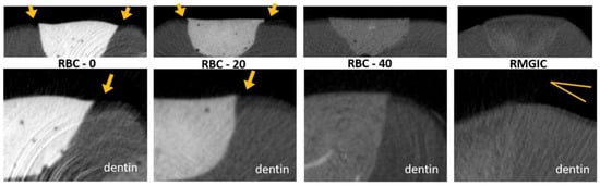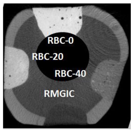 Example of a coronal section from a micro-computed tomography CT scan before incubation (t = 0), displaying a tooth specimen with the four restorations from the tested restorative materials at enamel level. The barium glass filler was responsible for increased radiopacity that was highest in RBC-0, corresponding to 60 wt.% Ba glass, and lower in RBC-40, having only 20 wt.% Ba glass. RMGIC had even lower radiopacity. In this way, materials could be immediately identified on micro-CT scans. Cavity dimensions are 4 mm wide and 2 mm deep.