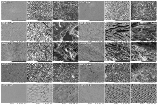 SEM characterization of the tested materials. Surfaces of specimens after 1-week storage in artificial saliva (1W) were compared with the ones produced by 48-h incubation with an S. mutans biofilm under constant acidic challenge.