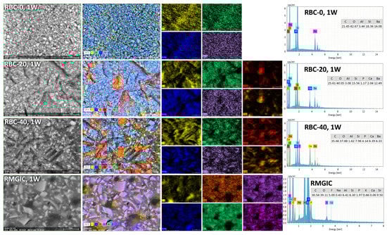 T-DCPD particles were displayed by SEM, having the shape of irregular microplates and a mean size of 10 μm (Figure 5). Such microplates had a dark grey signal indicating a composition of lightweight elements (Ca and P), as opposed to the Ba glass microparticles of the inert filler (mean size 1 μm). They were more abundant in RBC-40 than in RBC-20 and absent in RBC-0, in accordance with the material preparation. RMGIC showed filler particles with the same shape and size as the Ba glass but with a more widespread particle size distribution. The latter material also showed a higher organic-to-inorganic ratio. EDS analysis of the surface (Figure 6) confirmed experimental RBCs made of a Si-Al-Ba glass filler, to which Ca-P microplates were added in RBC-20 and RBC-40. The Ca-P surface content on RBC-40 was three times that of RBC-20. RMGIC was made of F-Al-Si glass with the addition of Sr and traces of Na, P. EDS analysis of ACID and BIO disks (Figure 7) showed a considerable decrease in surface Ca and P content, whereas no changes were observed in RBC-0 disks.