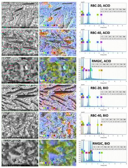 Furthermore, BIO disks displayed an increase in surface carbon content. RMGIC disks also underwent substantial changes in surface elemental composition, with RMGIC-ACID specimens showing depletion of F and Sr and a relative increase in carbon content. Moreover, RMGIC-BIO specimens displayed a decrease in carbon content compared with untreated disks (1W) and only a slight decrease in F and Sr.