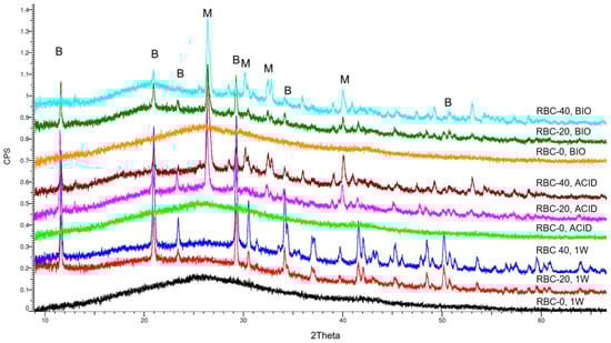 XRD identified an amorphous pattern with no crystalline phases in all RBC-0 disks (Figure 8). Immediately after storage (1W), peaks corresponding to crystalline DCPD were identified on the surface of RBC-20 and RBC-40, having a higher surface content of DCPD in RBC-40 than in RBC-20. Interestingly, the anhydrous Ca-P form of DCPD called monetite was also identified on RBC-20 and RBC-40 disks subjected to biofilm formation or acidic conditions (Table 1). A higher amount of monetite was detected on RBC-40 surfaces than on RBC-20, consistent with Ca-P presence.
