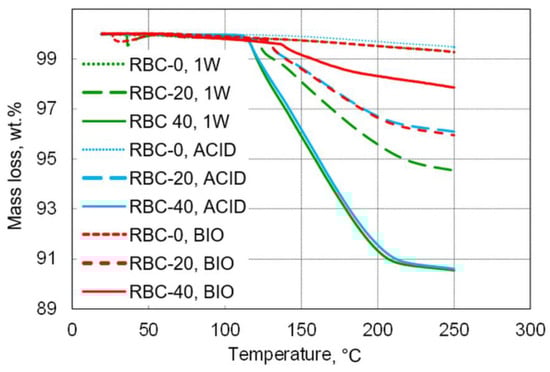 TGA was used to measure the water content of the tested materials, defined as the loss of mass between 20 and 105 °C (Table 2 and Figure 9). Very low overall amounts of free water content were detected, with the maximum free water content found in RBC-20 after storage (1W, 0.5 wt.%).