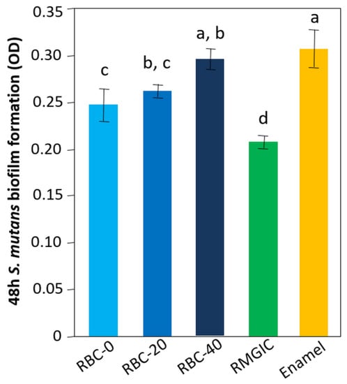 The lowest amount of viable biomass was found on RMGIC surfaces (p < 0.0001), indicating that this material exhibited significant antimicrobial activity. Similar amounts of viable biomass were identified on RBC-40 and enamel. RBC-0 and RBC-20 showed intermediate values between enamel and RMGIC (Figure 10).