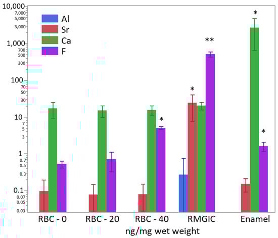 After weighing the wet biomass, data of ion content were converted into ng/mg of wet weight and log-transformed to achieve normal distribution. ICP-MS and F-ISE analysis (Figure 11) showed the presence of Ca2+ inside the biomass developed on all specimen surfaces. However, the calcium content was significantly higher in biofilms growing on enamel surfaces (p < 0.0001). A significantly higher (two orders of magnitude) presence of F− was identified in biofilms growing on RMGIC than in the other materials, whereas biofilms growing on enamel and RBC-40 showed a slight but significantly higher fluoride content than RBC-20 and RBC-0. Biofilms growing on RMGIC showed the presence of Al and Sr ions.