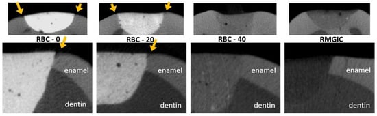 MicroCT coronal reconstructions of the interface between tested materials and dental tissues at the enamel level. Whole restorations and a close-up of one margin are displayed. Barium glass inert filler addition to experimental RBCs was responsible for the increased radiopacity and helped make the materials immediately identifiable. RBC-40, with the lowest barium content, had similar radiopacity to enamel, whereas the control RMGIC had similar radiopacity to dentin. RBC-0 and RBC-20 did not prevent enamel demineralization close to the restoration, which is a sign of initial secondary caries formation.