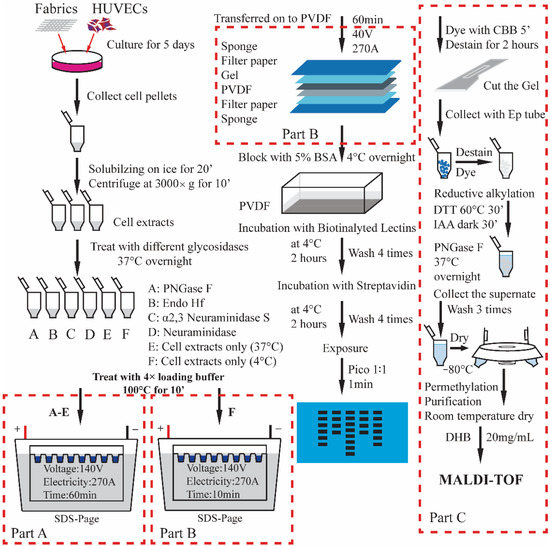 Five different fabrics identified as A-E in replicates of 4 were placed into 20 separate wells of a 24-wells plate, and the remaining 4 wells were set as control group (no fabric). HUVECs were seeded to each well at 50,000 cells/well, and cultured for 3 days at 37 °C in a 5% CO2 incubator. At the end of the third day, cell pellets were collected in 1.5 mL Ep tubes after being digested by trypsin. Along with cell lysis, SDS-PAGE, lectin blotting, and exposure, the profile of cellular N-glycans was obtained.