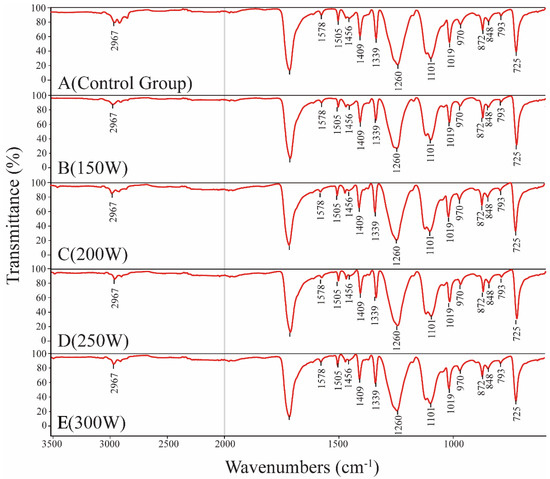 FTIR results after fabrics were treated with Ar low-temperature plasma treatment ((A): control group, (B–E): 20 Pa, 5 min, the power was 150 W, 200 W, 250 W, or 300 W).