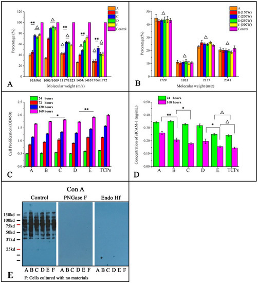 (A) The ratio of the peak intensity (12C:13C-glycans) of each fabric, and the control group was set to one. (B) The percentage of intensity of each peak to the total peaks of N-glycan. (C) Cell proliferation on the different fabrics after culture for one, three, five, or seven days. (D) sICAM-1 levels after cells are seeded on different fabrics for one and seven days. (E) The results of Con A lectin blots show that the cell extracts lost signal after PNGase F or Endo Hf treatment. (Sample A: control group, B–E: 20 Pa, 5 min, the power was 150 W, 200 W, 250 W, or 300 W, F: cells cultured with no materials, * p < 0.05, ** p < 0.01, △ p > 0.05, n = 3).