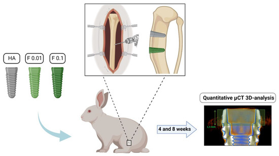 The biological characterization of the developed fluorapatite coatings was assayed in an in vivo translational model of the orthotopic implant placement, within the rabbit’s proximal tibia. The rabbit has been a popular choice for the evaluation of biomaterials’ biological response, reaching up to around one-third of the published literature on dental implant-related research [33]. Rabbits reach skeletal maturity at around 6 months of age, and given the fast bone turnover, allow an early evaluation of the bone tissue response [34]. Tibial implantation permits an adequate bone volume for the surgical placement of up to three clinically-relevant implants per side, within the range of 3 to 4 mm diameter and length up to 10 mm, allowing the use of routine characterization techniques to access osseointegration [35,36]. The thick cortical bone—broadly responsible for the primary fixation of the implants—also establishes a favorable environment for the early evaluation of the bone-to-implant interface [34].