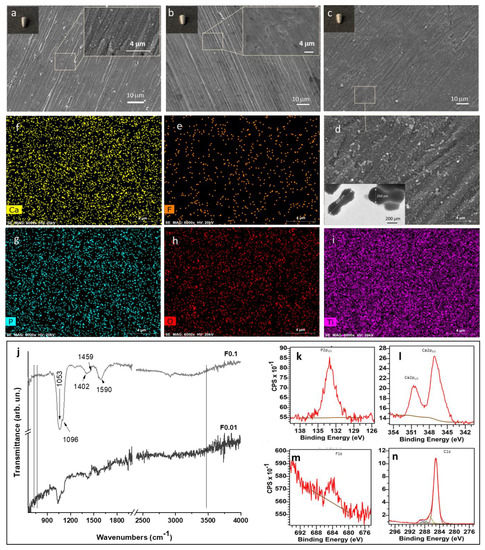 SEM images of the surfaces of the HA (a), F 0.01 (b), and F 0.1 (c) coatings obtained by the hydrothermal method. Magnified SEM image of F 0.1 (corresponding to the square area in (c)) and TEM image of F 0.1 coating particles (inset) (d). EDS elemental mapping images for F (e), Ca (f), P (g), O (h), and Ti (i) of the F 0.1 coating surface. ATR-FTIR spectra of the F 0.01 and F 0.1 coatings (j). XPS of the F 0.1 coating: (k) P 2p, (l) Ca 2p, (m) F 1s, (n) C 1s.