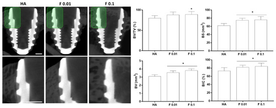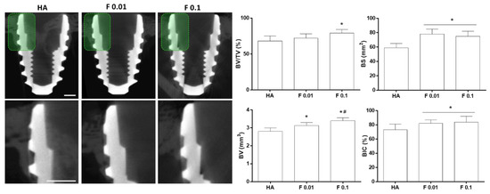 Bi-dimensional microtomographic images (left) and histomorphometric data (right) of the coated constructs—HA, F 0.01, and F 0.1, at the 8 weeks timepoint. Scale bars correspond to 1 mm. p < 0.05; * significantly different from control.