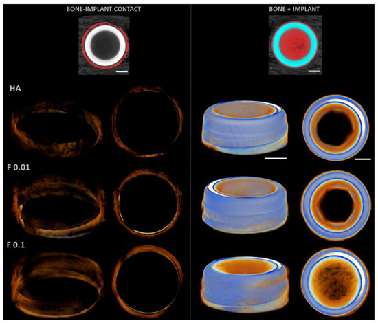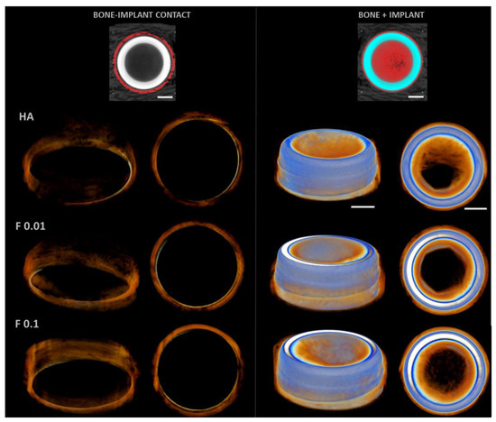 Representative three-dimensional microtomographic reconstructions of the coated constructs—HA, F 0.01, and F 0.1, at the 8 weeks timepoint. Scale bars correspond to 1 mm.