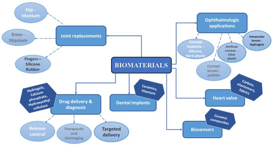 Biomaterials are a perfect alternative for conventional materials used in numerous biomedical applications as they manifest a low or negligible toxicity in relation to humans, other organisms, and to the environment. Applications of different groups of bioceramics include the replacement, repair, or regeneration of bone or teeth and coating of metallic implants [2,3,4,5] but is not limited to this. Hench and Wilson states that biomaterials are bioinert, tolerable, bioactive, and resorbable [6] and due to their interactions with bones or soft tissue, once inside the human body, biomaterials may form direct chemical bonds and accelerate the healing process and/or improve device adherence [7]. Without doubt, the most explored areas of biomaterials research are tissue engineering, drug delivery, and bone regeneration. In Figure 1, a schematic diagram containing various applications of biomaterials is presented [8].