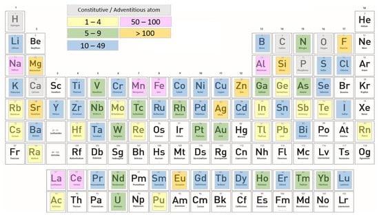 HAp has an excellent biocompatibility, but the bioactivity can be enhanced using substitution ions in its unit cell [62]. One disadvantage of synthetic stoichiometric HAp is having poor mechanical properties, and thus is not indicated to be used as a standalone material [63]. HAp is able to accept various compositional structures in its sub-lattices, and depending on which substitution ions are used, a new HAp composite with improved properties for specific biomedical applications can be obtained [64,65]. If we consider the evolution of trends in the type, frequency, and competition of dopants used, it can be observed that 72 elements of the periodic table were successfully incorporated into its structure. The overall use of individual chemical elements as dopants in HAp is presented in Figure 3 [66]. Chemical elements are marked with different colors, depending on the number of studies that were published with doped hydroxyapatite. The number of studies can be found in the legend.