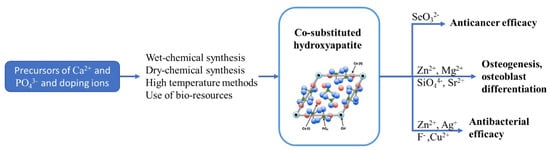 Co-doped hydroxyapatite can be synthesized from synthetic precursors and/or from biogenic sources. Ag+, Zn+, Cu2+, and F− act as antibacterial agents; Mg2+, Sr2+, and Mn2+ improve bone metabolism; and SeO32−, SeO42−, and Fe3+ have anti-cancer properties. The type, size, and concentration of ionic substitution agents can lead to changes in the microstructure, grain size, thermal stability, lattice parameters, crystal morphology, crystallinity, and solubility of HAp.
