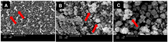 SEM images of the SrCO3 (A), Sr0.5Ca0.5CO3 (B), and CaCO3 (C) nanoparticles. The red arrows indicate the presence of micrometric particles due to aggregated nanosized particles. The scale bar corresponds to 5 µm. The images were acquired using accelerating voltage of 20 kV and 3000× magnification.