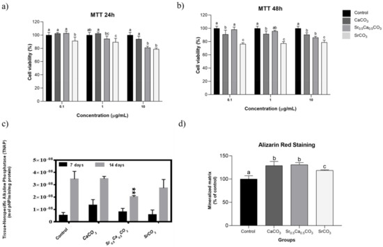 We tested the potential cytotoxic effect of the nanoparticles using cell assays in vitro. For this, we carried MTT assay at 24 and 48 h. The data depicted in Figure 3a,b showed that the nanoparticles did not significantly affect the viability of hDPSCs in concentrations up to 10 µg/mL, except for the SrCO3.