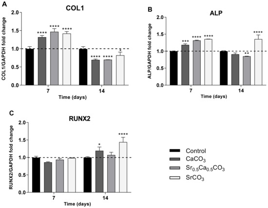 Expression of the osteogenic markers COL1 (A), ALP (B), and RUNX2 (C) by hDPSCs cultivated in the presence of 1 µg/mL Sr-carbonates for 7 and 14 days. The control corresponds to the cells cultivated in polystyrene plate in absence of the particles. Statistical analyses were carried out by two-way ANOVA, and Tukey’s post-test was performed in relation to the control; **** p < 0.0001, *** p < 0.001, ** p < 0.01, and * p < 0.05.