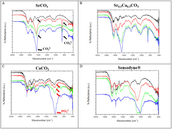 Chemical analysis of the dentin discs before and after brushing. ATR-FTIR of the dentin surface before (black lines) and after brushing for 1 (red lines), 7 (green lines), and 14 (blue lines) days with SrCO3 nanoparticles (A), Sr0.5Ca0.5CO3 nanoparticles (B), CaCO3 nanoparticles (C), and Sensodyne® Rapid Relief (D). The black and red arrows indicate changes in the bands assigned to the presence of CO32− and PO43− groups, respectively, after brushing.