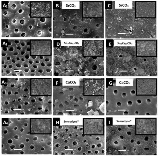 SEM imagens of the dentin specimens before (A1–A4) and after brushing with SrCO3 nanoparticles (B,C), Sr0.5Ca0.5CO3 nanoparticles (D,E), CaCO3 nanoparticles (F,G), and Sensodyne® Rapid Relief (H,I). Images C, E, G, and I were acquired after acid challenge. The inserts correspond to images with low amplification. The scale bar corresponds to 5 µm.