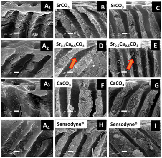 Transverse view SEM imagens of the dentin specimens before (A1–A4) after brushing with SrCO3 nanoparticles (B,C), Sr0.5Ca0.5CO3 nanoparticles (D,E), CaCO3 nanoparticles (F,G) and Sensodyne® Rapid Relief (H,I). Images C, E, G, and I were acquired after acid challenge. The scale bar corresponds to 2 µm. The orange arrows indicate the presence of particles inside the dentin tubules.