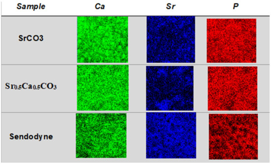 We performed EDS mapping of Ca, Sr, and P on the surface of dentin discs brushed with strontium-containing carbonate nanoparticles before (Figure 8) and after (Figure 9) acid attack to illustrate the quantitative results presented in Table 3. It is important to note that the maps obtained from the top view analysis are a sum of the contributions of the elemental content at the surface and the depth by which the electron beam can penetrate. The images evidenced strontium deposition on the surface (Figure 8—dark blue) and inside the tubules (Figure 9—dark blue) of the dentin discs brushed with SrCO3 nanoparticles or Sr0.5Ca0.5CO3 nanoparticles. With respect to brushing with Sensodyne® Rapid Relief, the presence of open tubules and low obliteration was clear and corroborated the SEM analysis (Figure 6). More interestingly, observation of the transversal cut of the dentin demonstrated calcium and phosphorus removal (Figure 9—green and red) from the top surface after the acid attack for all the dentin samples. However, strontium remained on the surface (Figure 9—dark blue), revealing the specific binding of this element to the discs and the resistance of the coatings to acidic conditions.