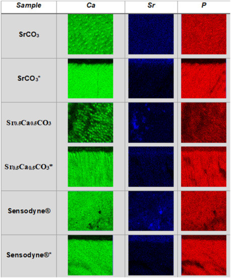 3.4. Quantification and Mapping of Ca, Sr, and P in Dentin Discs