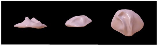 In 1984, Jacobson and Rosenstein formally reported the use of an obturator in newborn patients with cleft palate, along with its manufacturing process [34]. Firstly, they obtained a model of the patient’s maxillary situation using trays and alginate impression materials, after which a plaster working model was made. Based on this plaster working model, the obturator was designed and fabricated using hard and soft acrylics. Soft acrylic was applied on the nasal side to be more comfortable, while self-curing hard acrylic was used to cover the soft acrylic in the lateral maxillary segment and the medial region (Figure 1).