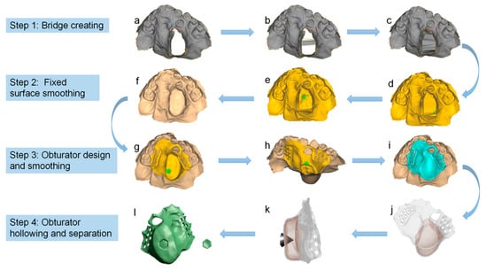 The process of manufacturing a digital ONF obturator [21] The whole process consists of four steps: bridge creation (a–c), fixed-surface smoothing (d–f), obturator design and smoothing (g–i), and hollow and separation (j–l).