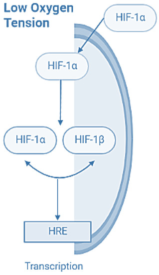 Chondrocytes must adapt to a low oxygen tension environment to produce adenosine triphosphate (ATP) by substrate-level phosphorylation in glycolysis because glucose uptake, such as lactate production and glucose metabolism, is inhibited by less than 1%. This is why chondrocytes need at least some oxygen for their basal metabolic activity. There is evidence that chondrocytes express hypoxia-inducible factor 1α (HIF-1α); HIF-1α by low oxygen, translocates to the nucleus where it dimerizes with HIF-1β to form an active transcription factor. HIF-1α recognizes and binds to hypoxia response elements (HRE) for the promoters of target genes, including those involved in angiogenesis and cell proliferation, and regulates glycolysis (Figure 1) [17].
