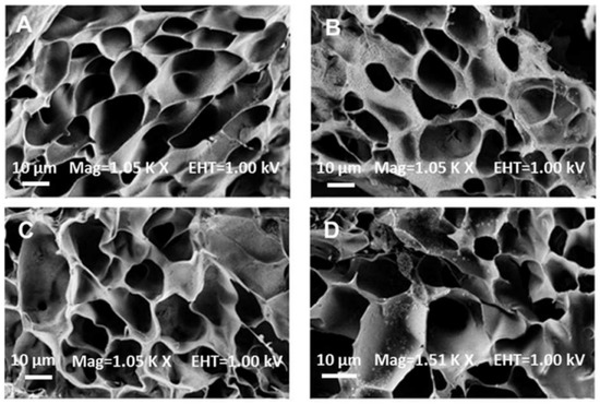 SEM images of GelMA/CPO composites with different concentrations of CPO: (A) 0% CPO, (B) 1% CPO, (C) 2% CPO, and (D) 3% CPO. High concentrations of CPO increased porosity and swelling [23]. Copyright 2017, American Chemical Society.