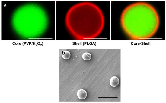 Confocal and SEM images of VP/H2O2 core-shell oxygen-releasing nanoparticles designed to encapsulate cardiosphere-derived cells (CDCs): (a) confocal images of a polymer core of PVP/H2O2, scale bar = 5 μm, and (b) SEM image of oxygen-releasing microspheres. Scale bar = 10 μm. Reprinted from [13]. Copyright 2012, with permission from Elsevier.